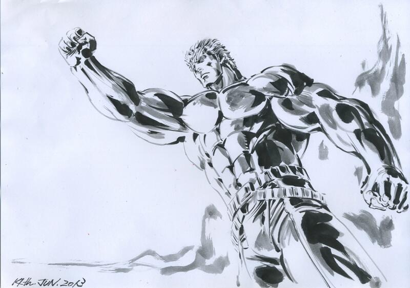 1boy arm_up dated hayama_jun'ichi hokuto_no_ken i_don't_have_a_single_regret_in_my_life marker_(medium) monochrome muscle raoh short_hair solo traditional_media utsumi_kenji rating:s parent:none source:https://pbs.twimg.com/media/BMqNxdTCYAAafDB.jpg:large