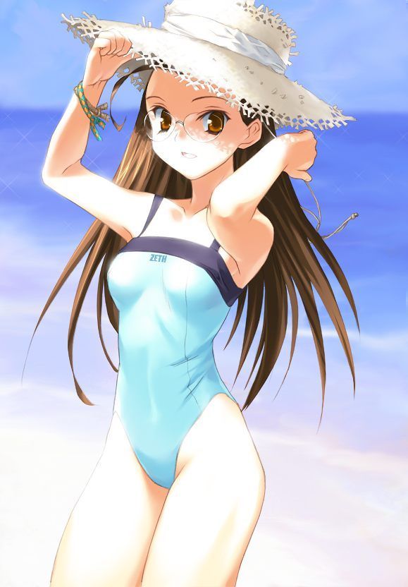 1girl arms_up bare_arms beach blue_one-piece_swimsuit bracelet breasts brown_eyes brown_hair collarbone cowboy_shot day glasses hand_on_headwear hat jewelry long_hair looking_at_viewer magic_the_gandhi official_art one-piece_swimsuit orion_(orionproject) outdoors parted_lips rance_(series) rance_vi small_breasts smile solo standing straw_hat sun_hat swimsuit thighs third-party_source rating:s parent:none source:https://livedoor.blogimg.jp/korehanani/imgs/f/5/f50758b3.jpg